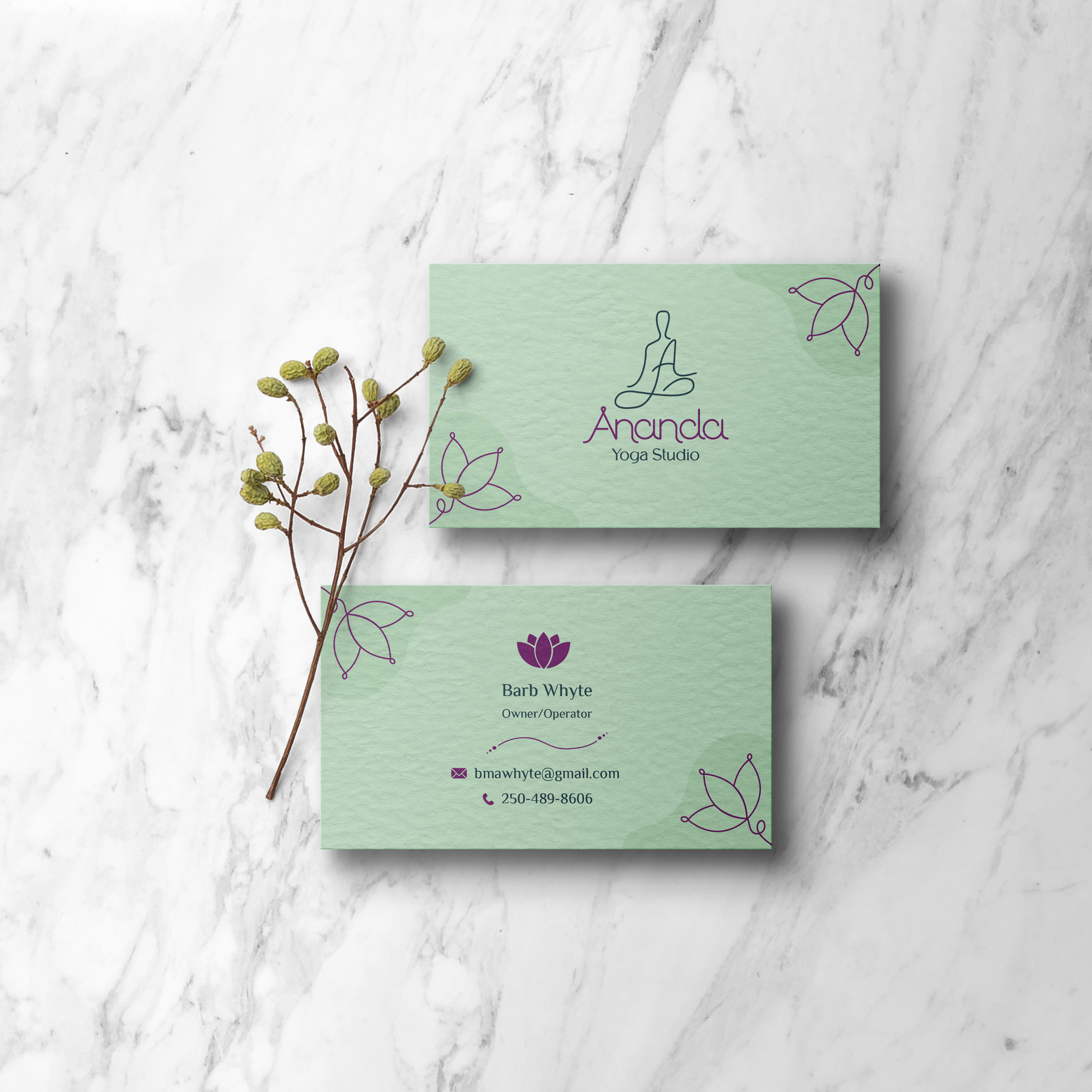 For Ananda Yoga, I created a cohesive brand identity reflecting the studio’s core values. Inspired by Sanskrit symbology, the logo balances Shtira (stability) and Sukha (bliss) through a yoga pose symbolizing mindful breathing. Greens and purples convey peace and serenity, and the identity extends to business cards and intake forms, resulting in a welcoming, harmonious brand that embodies the spirit of the studio.