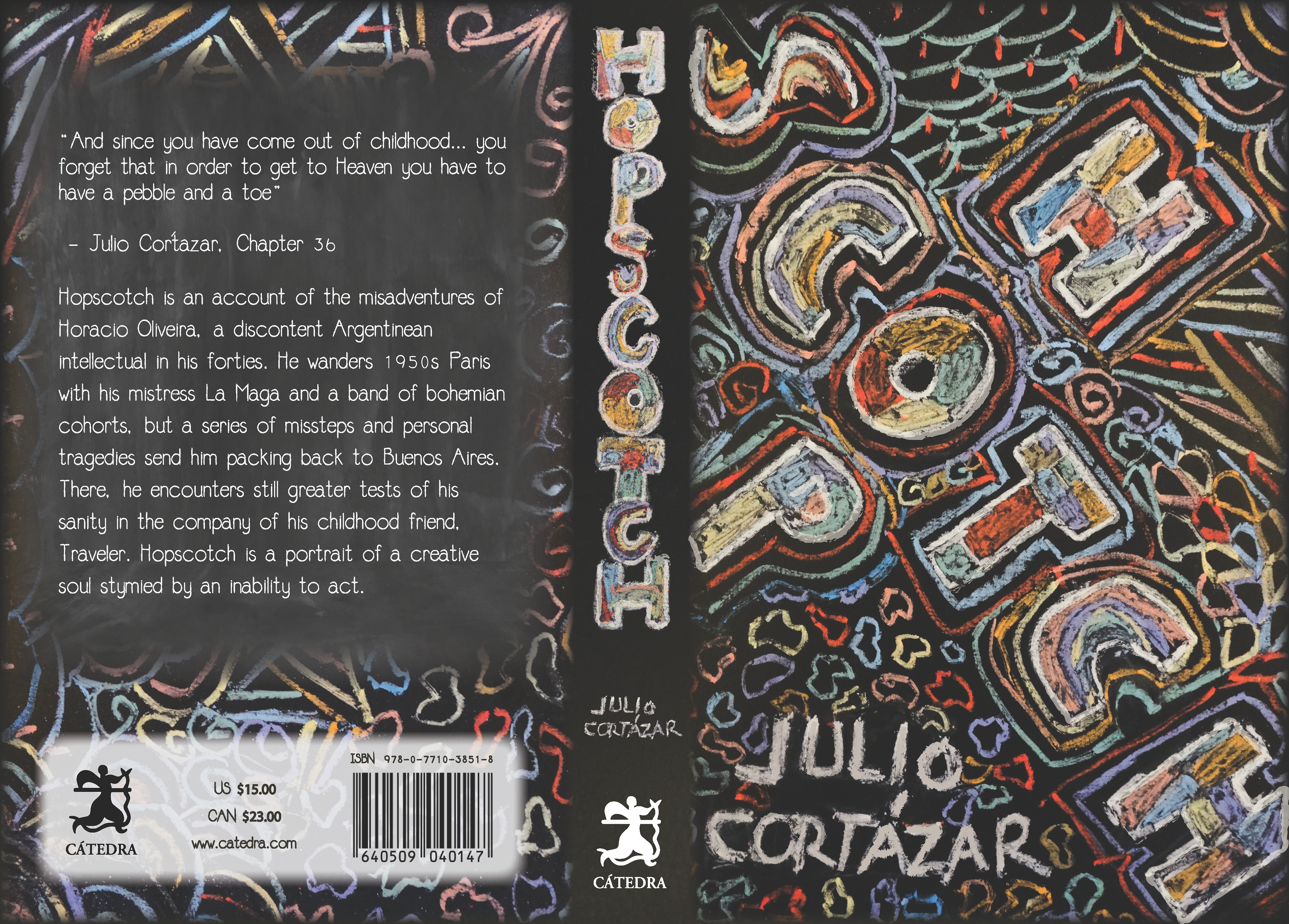 My objective was to give Julio Cortázar’s Hopscotch a fresh look that would spark curiosity in young Canadian readers and rescue this Latin-American classic from being overlooked. I started by drawing the cover by hand with chalk (clear, nostalgic, and playful) before refining it in Illustrator to balance texture with polish. Childhood colors and subtle hopscotch-inspired typography bring a sense of ease and approachability, while the chalk texture keeps the design light and engaging. The result is a cover that feels vibrant and accessible, while staying true to the inventive spirit of Cortázar’s work.
