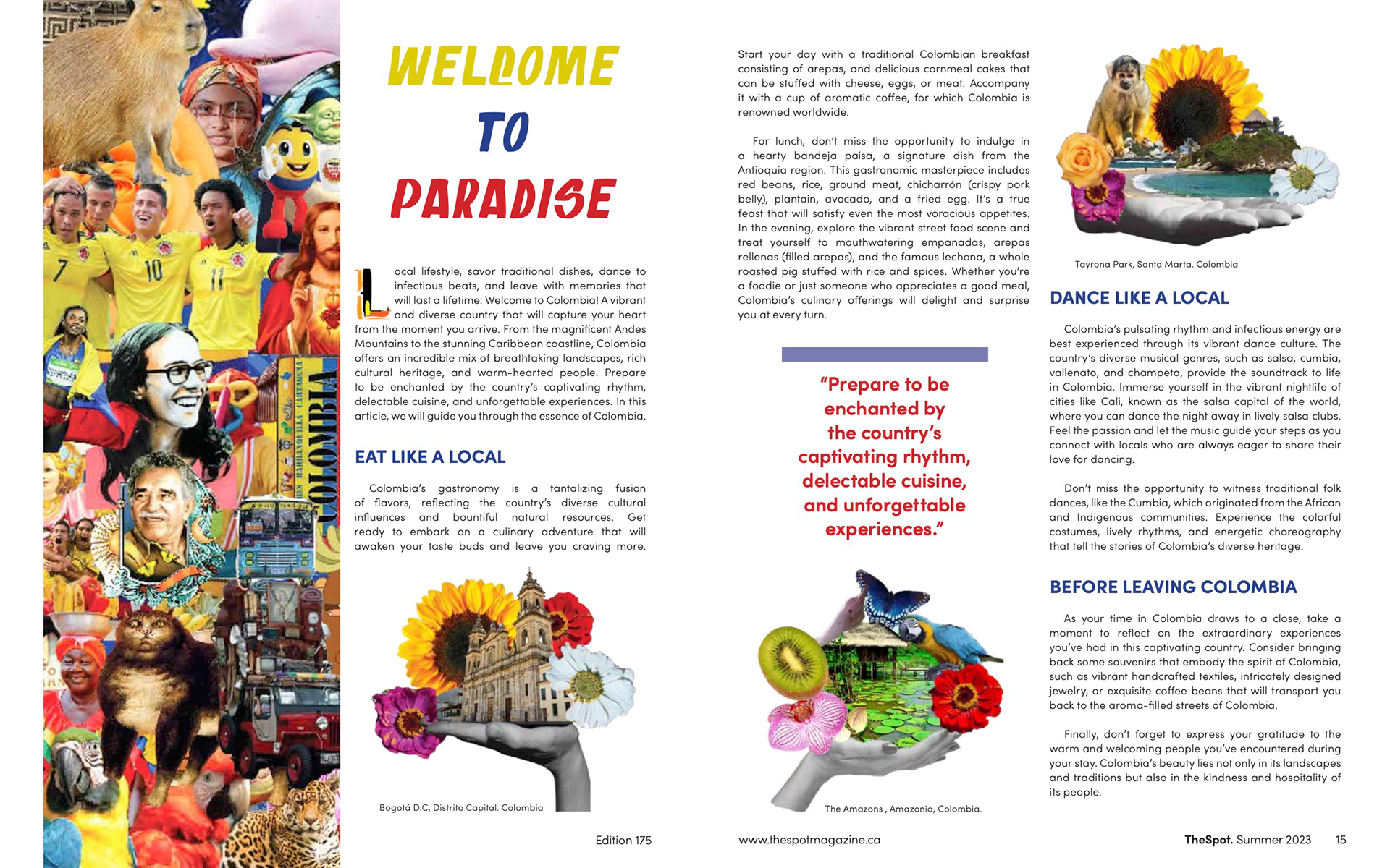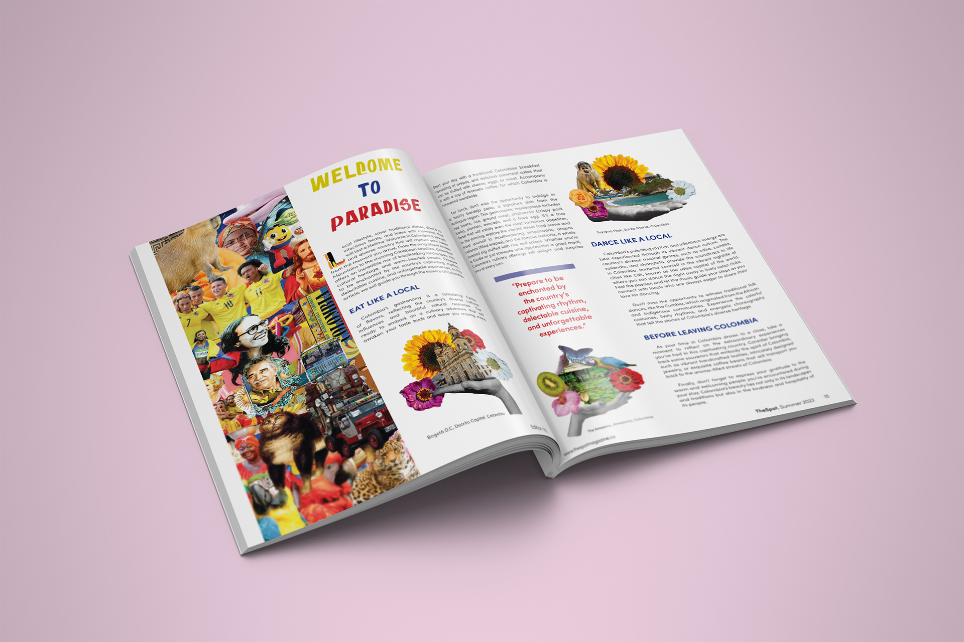 For The Spot Magazine, I designed a 4-page spread showcasing Colombia’s vibrant culture and rich tapestry of life. Inspired by the colorful art of public spaces and the kitsch aesthetic of Latin America, the design blends magical realism with cultural nuance. Bold visuals and a clean layout work together to guide readers seamlessly through the content.